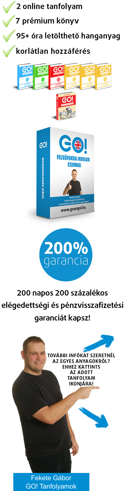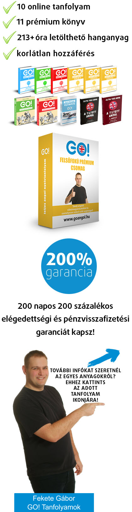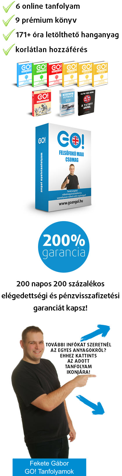Bízhatsz bennünk. 2011. óta itt vagyunk, soha nem verünk át senkit, nem véletlenül tanul velünk sok tízezer ember angolul. Sőt, tudod: a 200 napos garanciád véd Téged, tehát ha Neked nem tetszik az anyag, amit kapsz, akkor csak visszaküldöd nekünk, és 5 napon belül már nálad is van a korábban befizetett teljes összeged. A GO!-val semmit nem kockáztatsz.